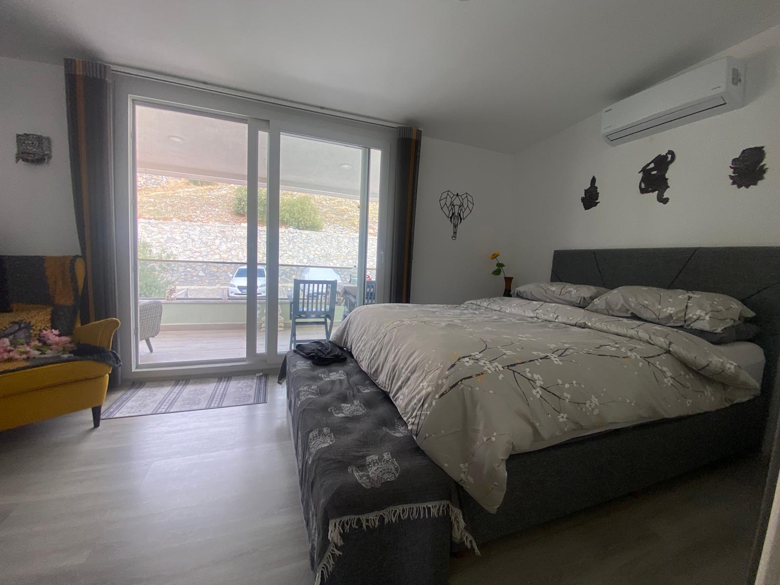 Görsellerde de göreceğiniz üzere, Akbük Körfezi'nin tüm mavisini ayaklarınızın altına seren bu daire, bölgedeki muadillerinden çok özel bir avantajıyla ayrılıyor: Kot farkı sayesinde binanın arkasından merdiven çıkmadan, düz ayak giriş imkanı sunuyor!